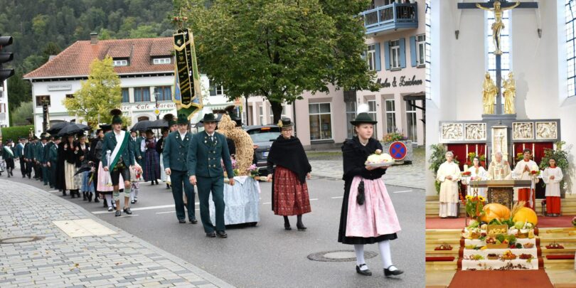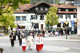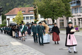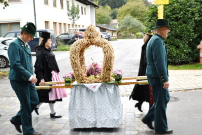 Die Musikkapelle, der Trachtenverein mit den Fahnenträgern und der Schützenverein versammelten sich am Ritter Marquart Brunnen bis sie vom Diakon Johannes Notter und den Ministranten abgeholt wurden. Gemeinsam ging ein Zug -angeführt von der Musikkapelle mit dem Marsch „Mein Heimatland“- und der großen Erntekrone zur Kirche „Zum kostbaren Blut“.