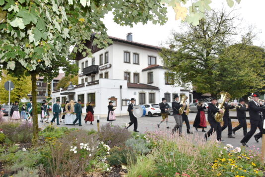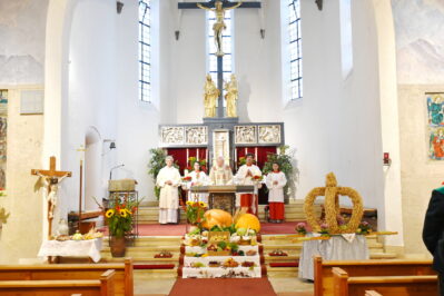 Dort erwartete Ruhestandspfarrer Hans Krämmer die Gemeinde zum Erntedank-Gottesdienst. Die Kirche war festlich geschmückt mit herbstlichen Blumen und den geernteten Gaben der Natur, dominiert von zwei sehr großen Kürbissen. Diakon Johannes Notter nahm die Lesung aus dem Evangelium nach Lukas, in dem die Apostel Jesus um Stärke im Glauben bitten, zum Anlass für seine Ansprache. Er meinte, es gehe nicht um Größe im Glauben, eher um den Grund des Glaubens. Beim Erntedankfest geht es um die Früchte der Erde – oder um die Früchte in Nachbars Garten – als Metapher für die Eigenschaft der Menschen sich zu vergleichen und Neid zu empfinden. Im Neid sah der Diakon die Quelle zu Unzufriedenheit und meinte, hier soll der Glauben einen Gegenpol setzen. Das Erntedankfest soll daran erinnern, auch für das Kleine dankbar zu sein. Der Gottesdienst wurde musikalisch tongewaltig von der Musikkapelle Marquartstein begleitet, die auf der Empore spielten.