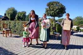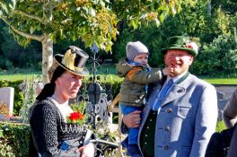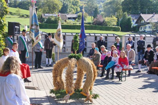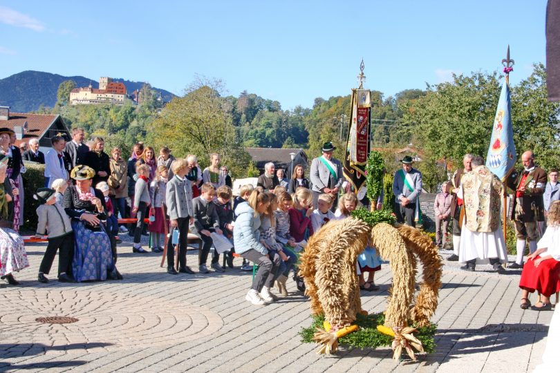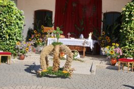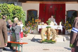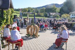 Der weitläufige Vorplatz vor dem Leichenhaus war Mittelpunkt der Messfeier zum Erntedankfest in Neubeuern – so konnten die Abstände und Coronaregeln eingehalten werden. Im Mittelpunkt vor dem Altar war die beim “Schopper” in Neuwöhr gebundene neue Erntekrone. Ein Zeichen der Verbundenheit und Dankbarkeit, für ein Leben in Einklang mit Natur und Schöpfung. Die Fahnenabordungen formierten sich im Kreis um das Geschehen. Pfarrer Christoph Rudolph vermittelte den Dank an das Geschaffene, verbunden mit der Einheit im Glauben an Gott. Den mit Feldfrüchten geschmückten Altar zierte auch eine Butterfigur, diesmal weil es prägend für die Zeit ist mit dem Abild der Hl. Corona. Die Figur wurde wieder wie alljährlich von Amalie Scherer geschaffen. Die Segensbitten galten auch der Vernunft mit weniger zufrieden zu sein, die Werte besser zu schätzen und im Einklang mit der Natur zu leben. Der Pfarrer erbat den göttlichen Segen und Schutz für die Arbeit und unsere Heimat. Gemeinsam sang man zum Abschluß “Großer Gott wir loben Dich”