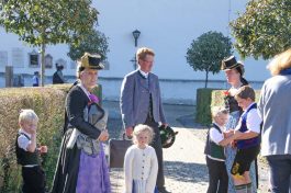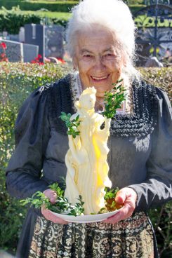 Die Fotos zeigen die Erntekrone, Messnerin Gertraud Leitner mit der Dorfbäuerin Grießenböck auf deren Hof die neue Erntekrone gebunden wurde, die Messnerin mit der von Amalie Scherer geschaffen Butterfigur, Familie beim Kirchgang