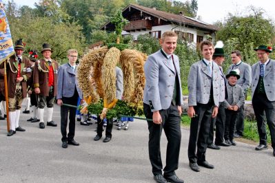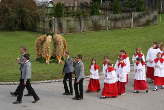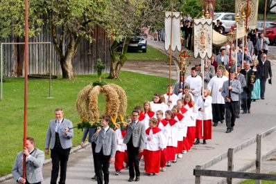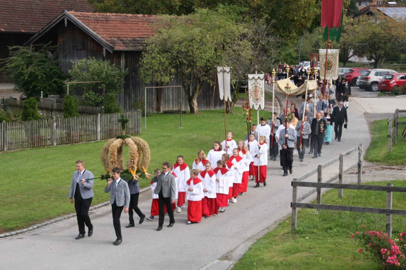 In beeindrukender Teilnahme feierte die dörfliche Glaubensgemeinschaft das Fest zum Entedank mit Gottesdienst und Prozession. Pfarrer Christoph Rudolph mit einem vielköpfigen Altardienst und der Kirchenchor gestalten die Messfeier in beeindruckender Weise. Der Pfarrer verglich den Weg der Israeliten  aus Ägypten mit der vielfälligen Flucht und Völkerwanderung, welche die Menschheit,früher wie auch heute bedrückt. So wie der Dank zur Sicherheit soll für uns auch der Dank für Gottes Segen und die gelungene Ente im Vordergrund stehen. Mahnend sein Appel sorgsam mit der Schöpfung umzugehen, keine Lebensmittel zu vernichten.  Mit den Fahnen der Ortsvereinen, den Antlaßfahnen, der neu gebundene Erntekrone, in Tracht und Montur die Kirchgänger, ging die Dankprozession durch Altenbeuern. In der festlich geschmückten Kirche, bei der Hymne “Großer Gott” fand die Messfeier ihr Ende.