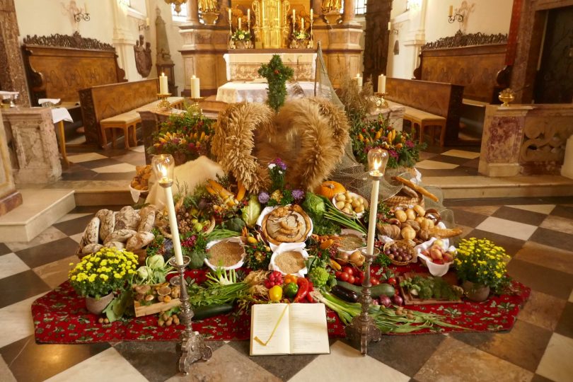 „Gott sei Dank“ – mit diesen täglich gebrauchten Worten begann der Gottesdienst in der reichlich geschmückten Priener Pfarrkirche. Pfarrer Peter Bergmaier verwies seiner Predigt auf die Bedeutung der täglichen Ernährung, deren Wert in Zeiten übervoller Supermärkte immer geringer geschätzt werde und bedankte sich für den reichlich geschmückten Altar zu Erntedank. Traditionell wurde der Altar vom Priener Trachtenverein gestaltet. Uschi Feßler und Thomas Wehringer arrangierten die „Ernte“, die u.a. von der Gärtnerei Krumrey und der Bäckerei Müller gestiftet wurde, in sehr ansprechender Weise vor dem Altar.