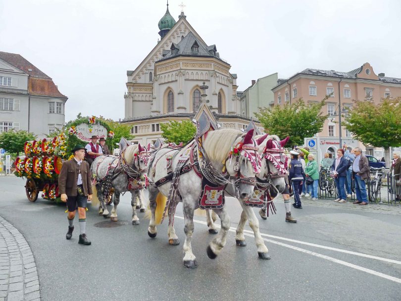 Farbenfroh und fröhlich zeigte sich der Festzug anlässlich des heurigen Erntedankfestes in Rosenheim. Der Festzug führte von der Stadtpfarrkirche St. Nikolaus zur Loretowiese und dort hinein in das Flötzinger Festzelt und in die Auerbräu Festhalle, beide Brauereien waren mit ihren Gespannen an der Schönheit des Festzuges beteiligt.