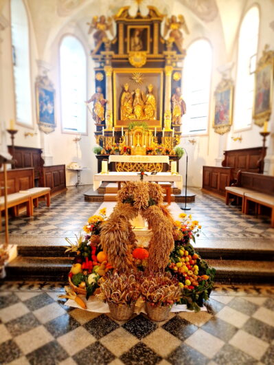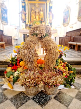 Ein festlicher Erntedank-Gottesdienst wurde in der schön mit Erntekrone sowie mit Garten- und Feldfrüchten geschmückten Filial- und Wallfahrtskirche von St. Salvator mit Pfarrvikar Amit Sinha Roy gefeiert.