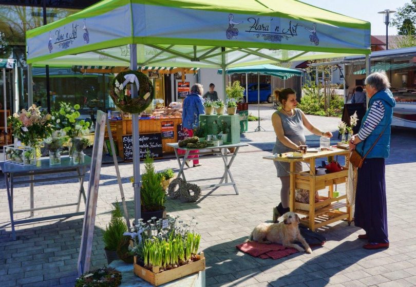 Der Bernauer Wochenmarkt ist nicht nur ein Ort zum Einkaufen, sondern auch zum Verweilen und Austauschen. Mittlerweile ist der Markt zu einem beliebten Treffpunkt bei Kaffee und anderen Leckereien geworden. Für musikalische Unterhaltung sorgen „De zwoa Samer“ mit Harfe und Ziehharmonika.