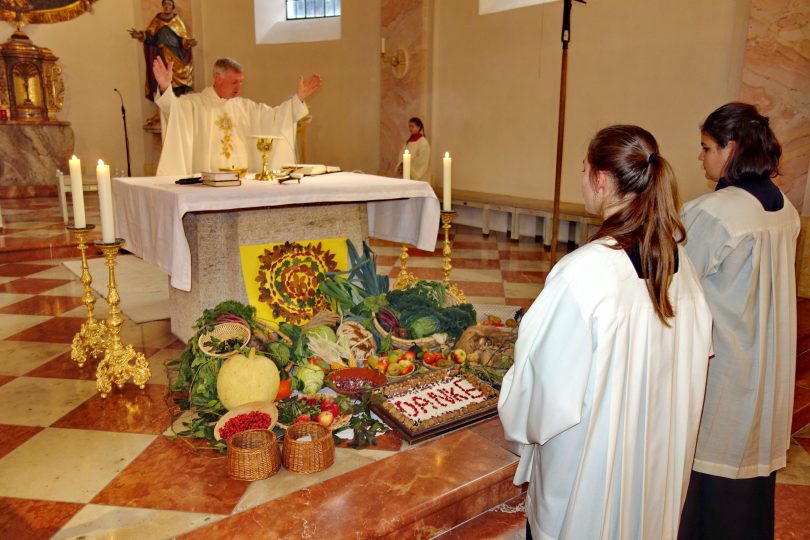 „Wer genießen kann, ist genießbar.“ Dies waren die Worte von Pfarrer Martin Straßer beim vom Kirchenchor feierlich umrahmten Festgottesdienst an Erntedank in der Reit im Winkler Pfarrkirche St. Pankratius. Es sei nicht selbstverständlich, sondern etwas Besonderes, wenn man sich dankbar über die von Gott gegebenen Gaben freuen könne, wie es auch in diesem Jahr wieder der Fall gewesen sei. „Der Wohlstand, den wir erleben dürfen, ist ein Geschenk und eine Gnade“, so seine Worte. Sein besonderer Dank galt den Kindern der dritten und vierten Klasse der Grundschule für ihr liebevolles Schmücken des Altars mit Früchten. Anstelle der wegen schlechtem Wetter ausgefallenen sonst an Erntedank anschließenden Prozession durch den Ort wurde nur der vierte Altar mit der Aussetzung des Allerheiligsten und kleinem Umgang in der Kirche mit den Ministranten und der Bruderschaft und dem abschließenden eucharistischen Segen zelebriert.