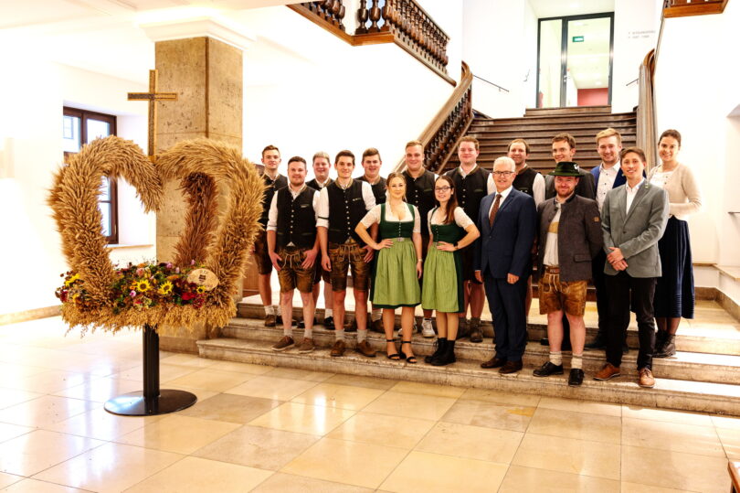 Ein traditionsreicher Termin mit Fokus auf Zukunftsthemen: Die Bayerische Jungbauernschaft übergab eine aus verschiedenen Getreideähren kunstvoll gebundene Erntekrone an das Staatsministerium für Ernährung, Landwirtschaft, Forsten und Tourismus. In Vertretung von Bayerns Landwirtschaftsministerin Michaela Kaniber nahm Amtschef Hubert Bittlmayer die imposante Krone von einer Delegation der Jungbauernschaft Kirchberg im Landkreis Landshut entgegen.