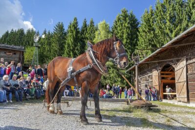 War das Getreide geerntet und auf den Hof gebracht, stand dem Bauern und seiner Familie eine weitere schweißtreibende Arbeit bevor – das Dreschen. Wie sich diese Arbeit im Laufe der Geschichte durch technische Hilfsmittel wandelte, zeigt das Freilichtmuseum in Vorführungen. Die Bandbreite der Dreschtechniken reicht dabei vom Dreschen per Hand mit Hilfe des Dreschflegels über den Einsatz von Pferdestärken am Göpel bis hin zur dampfbetriebenen Breitdreschmaschine. Eine Besonderheit ist die Demonstration eines Modelldampftraktors im Maßstab 1:3, der dampfend und schnaubend durch das Museumsgelände tuckert. Kinder können das Dreschen selbst ausprobieren. Und wer Getreide in Form von köstlichem Brot mit nach Hause nehmen möchte, sollte am historischen Backhaus aus Arget vorbeischauen.