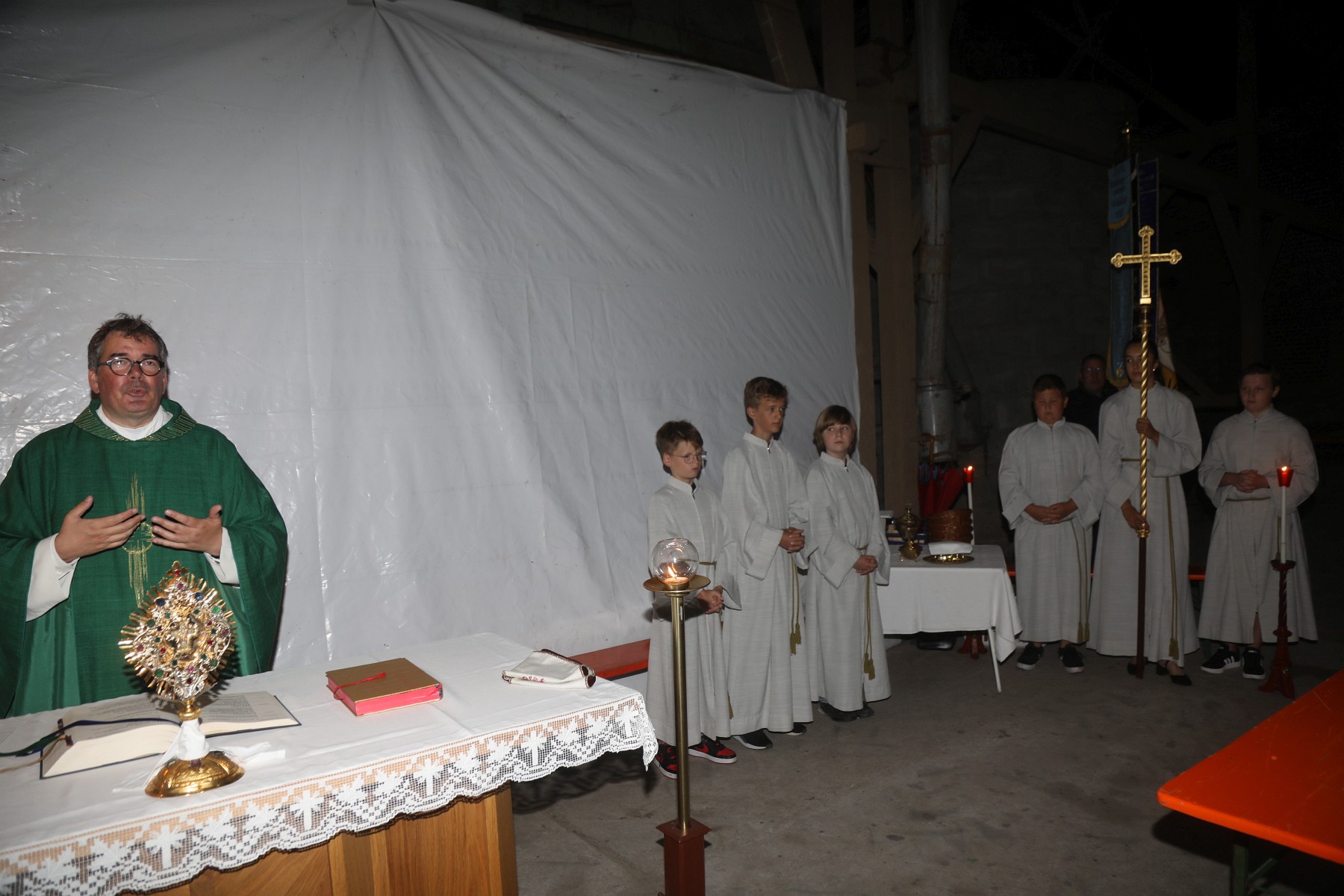 Der Veldener Pfarrer Tobias Rother zelebrierte die Gottesdienstfeier wegen dem Regenwetters am Sonntag im Stadel am Haiderhof