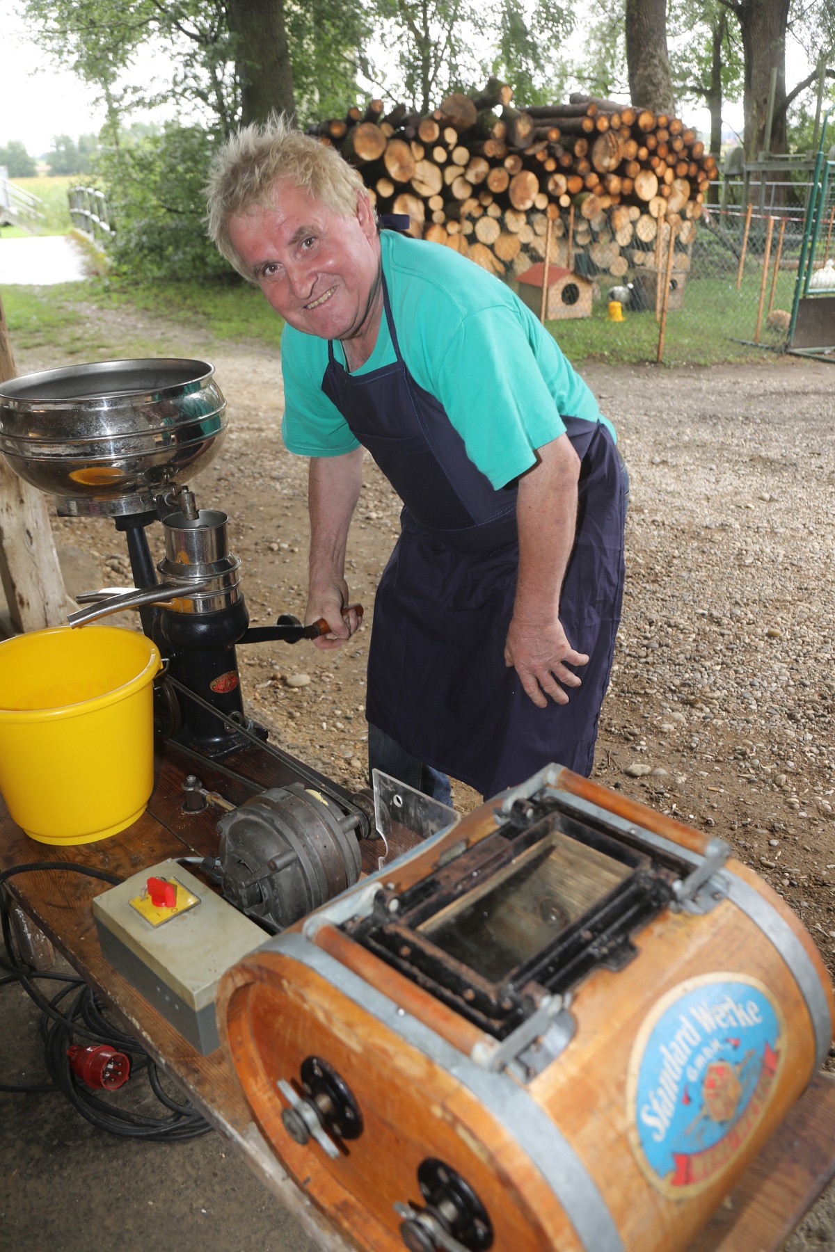 Der 67-jährige Martin Weichselgartner erläuterte die Arbeitsschritte einer Milchzentrifuge bis hin zum Ausbuttern vorne im hölzernem Butterfass