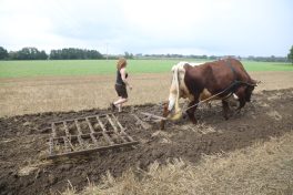 -1298/1300 Der siebenjährige Ochse “Ignatz” vom Maxi Leipfinger aus Windstoß führten die Feldbestellung mit einer hözernen Egge vor