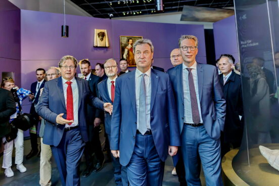 0113_(v.l.n.r.): Dr. Richard Loibl, Direktor des Hauses der Bayerischen Geschichte zeigt beim Rundgang dem Ministerpräsidenten der Tschechischen Republik Prof. Petr Fiala, dem Bayerischen Ministerpräsidenten Dr. Markus Söder, MdL und dem Bayerischen Staatsminister für Wissenschaft und Kunst Markus Blume die Highlights der Ausstellung. Dahinter Albert Füracker, Bayerischer Finanz- und Heimatminister © Haus der Bayerischen Geschichte | Foto: www.altrofoto.de