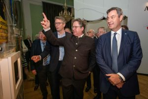Beim gemeinsamen Rundgang durch die Bayerische Landesausstellung „Typisch Franken?“ (v.r.n.l.): Ministerpräsident Dr. Markus Söder, Direktor (HdBG) Dr. Richard Loibl und der Staatsminister für Wissenschaft und Kunst Markus Blume. © Haus der Bayerischen Geschichte | Foto: André De Geare