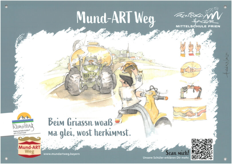 Endlich ist es so weit – Rimsting kann seinen Mund-ART Weg eröffnen. Dazu heißt es von Gemeinde und Tourist-Information: „Daß unsere bairische Sprache sehr vielschichtig ist, wollen die Schülerinnen und Schüler mit den Lehrkräften der Franziska-Hager-Mittelschule Prien mit Ihren neu konzeptionierten MundArt-Wegen der Öffentlichkeit vor Augen führen. In jeder Gemeinde des Schulsprengels werden Wegabschnitte mit bis zu zehn Schildern ausgestattet.