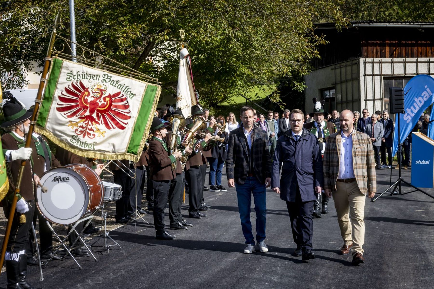 Die Eröffnung wurde mit einem Landesüblichen Empfang in Anwesenheit der Fahnenabordnung des Schützenbataillons Stubai und der Musikkapelle Schönberg umrahmt. (v.l.): Adrian Siller (Obmann des TVB Stubai Tirol), Philip Wohlgemuth (1. Landeshauptmann-Stellvertreter und Sportlandesrat) und Daniel Stern (Obmann des Planungsverbandes Stubaital). © TVB Stubai Tirol / Jan Hetfleisch