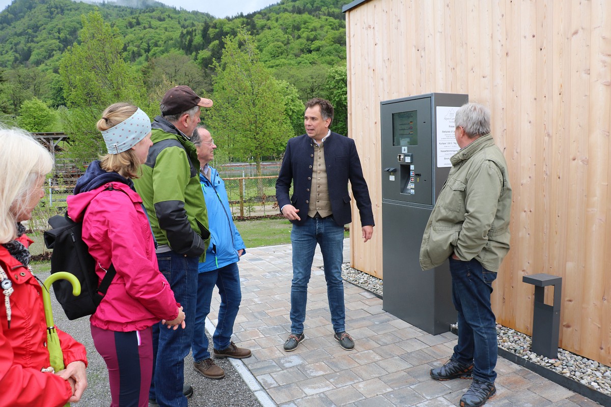 Werner Heinrichsberger junior erklärt den Besuchern der Eröffnungsveranstaltung die Nutzung des Zentralgebäudes auf dem „Alpen Camping“ Wohnmobilstellplatz