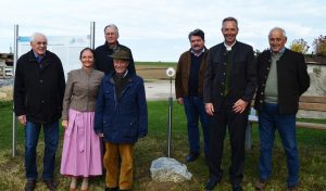 Bei der Einweihungsfeier: Ferdinand Steffan, ehemaliger Kreisheimatpfleger, Projektmanagerin Annette Marquard-Mois, Dr. Georg Kasberger, AELF Rosenheim, Professor Dr. Siegmar von Schnurbein, Schirmherr der Römerregion Chiemsee, Josef Reithmeier, Vorsitzender der Leaderregion Chiemgauer Seenplatte, Breitbrunns Bürgermeister Anton Baumgartner und Dorfarchivar Franz Burghardt bei der Einweihung der Römerstation (von links). Foto: Tschali Wastl
