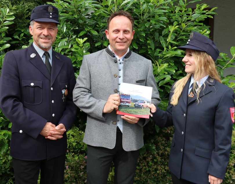 Der erste Vorsitzende der Feuerwehr Umrathshausen Georg Noichl und Autorin Elisabeth Schäffer übergaben das erste Exemplar der druckfrischen Festschrift zum 150-jährigen Vereinsjubiläum an den Schirmherrn des Festes Bürgermeister Daniel Mair. Das Gründungsfest wird vom 13.Juli bis zum 18. Juli im Festzelt in Umrathshausen gefeiert.