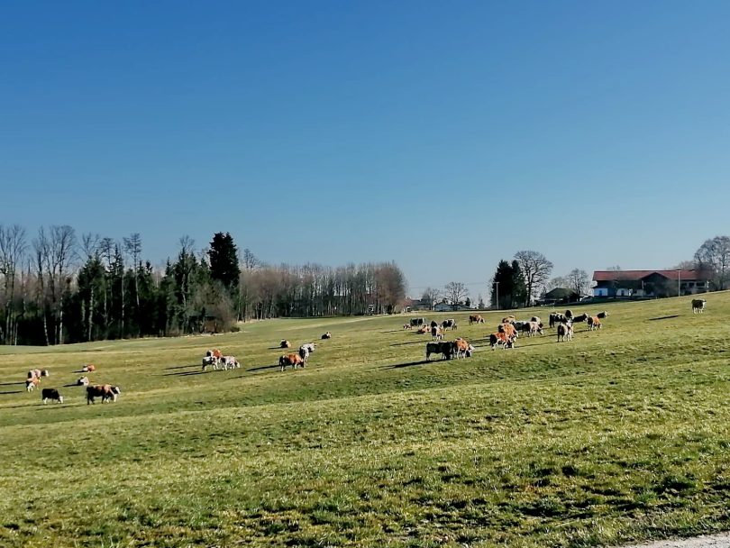 Auch wenn es derzeit für die Jahreszeit zu trocken ist und damit das Wachstum auf den Wiesen und Feldern beeinträchtigt ist, sind schon die ersten Rindvieher schon im Freien und weiden auf den Weiden – wie diese aktuelle Aufnahme nahe Neukirchen in der Gemeinde Riedering zeigt.