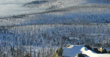 Da Schnee aufm Berg hot pappt schwaar auf de Äst,