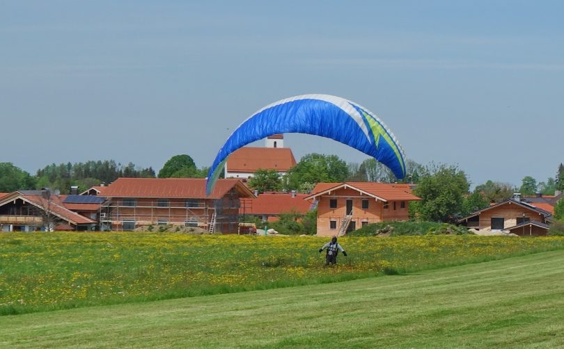 Fotos: Hötzelsperger – Landung des Gleitschirmfliegers mit der Kirche von Grainbach im Hintergrund