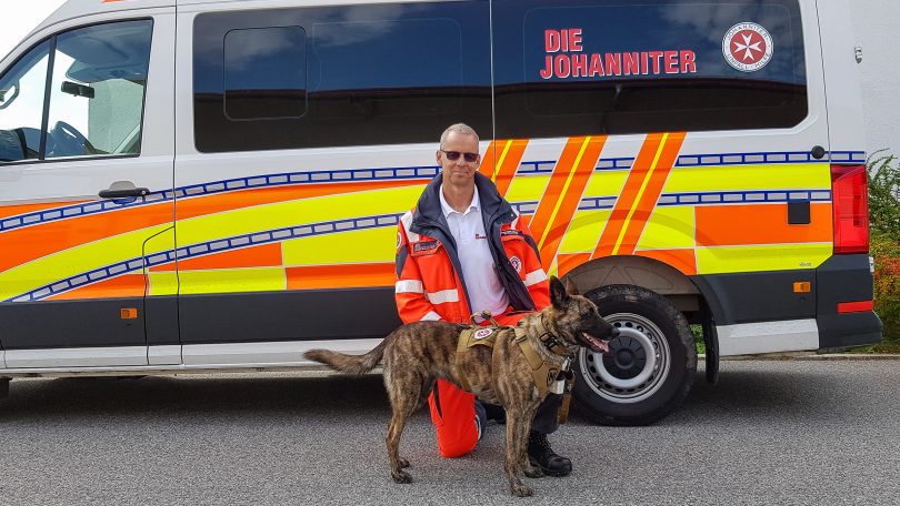 Foto: Dr. Andreas Böhm/Johanniter –  Auf Anhieb haben am Wochenende Mantrailer Ati und Hundeführer Clemens Joos die Prüfung bestanden.