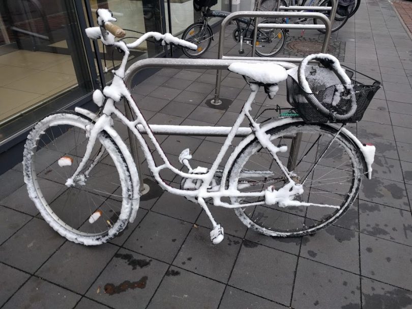 Der Radfahrer in Prien war wohl weniger begeistert von der weißen Pracht, denn er hat sein Stahlross vor dem Supermarkt einfach stehen gelassen!