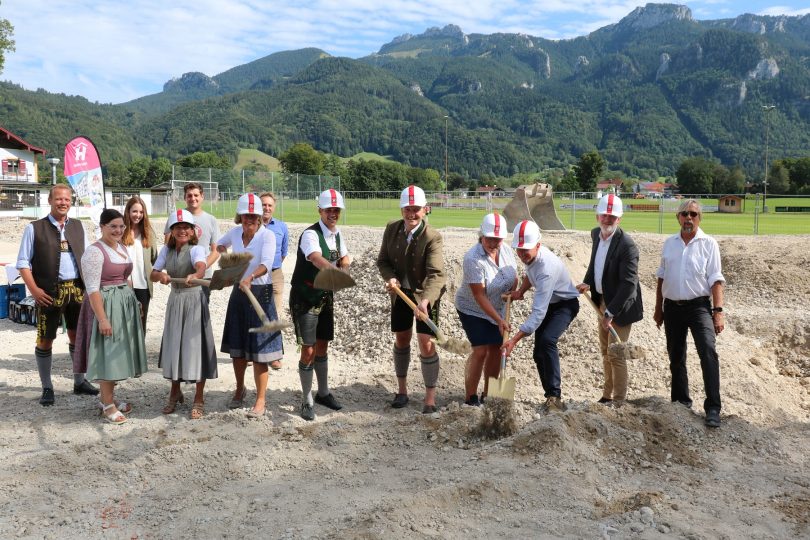 „Wir haben uns miteinander ein großes Projekt vorgenommen, wir wollen gemeinsam die neue Aschauer Sporthalle – die Priental-Halle – bauen und damit endlich die Planungen verwirklichen, die seit acht Jahren herangereift sind“, so Bürgermeister Simon Frank beim ersten Spatenstich zur neuen Priental-Halle zu Füßen der Kampenwand. „Ein gutes Projekt hält Qualität, Zeit und Kosten ein“ mahnte er die anwesenden Vertreter des Architekturbüros SRW-Plan aus München, der Baufirma Hillenbrand aus Wals-Siezenheim, die Mitglieder des Aschauer Gemeinderates und die Verantwortlichen der Bauverwaltung im Rathaus. „Wir wünschen uns einen unfallfreien Verlauf der Baumaßnahmen und freuen uns auf ein zünftiges Richtfest im Spätsommer 2024“. Sprachs und schaufelte zusammen mit seinen beiden Stellvertretern Michael Andrelang und Monika Schmid, mit Architekt Rafael Schulik und dem Vertreter der Baufirma Hillenbrand Josef Feichtenschlager ein paar Schaufeln voller Kies aus der frischen Baugrube.