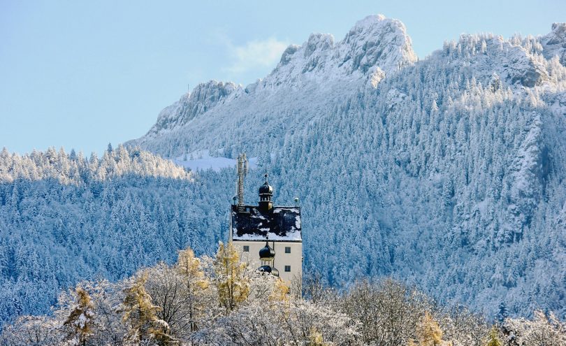 Die mit goldgelben Nadeln bestückten Lärchen auf dem Aschauer Schlossberg geben einen perfekten Kontrast zur überzuckerten Winterlandschaft wie hier in Aschau i.Chiemgau ab, ja das Wintermärchen ist eingeleitet. Vom Zeitpunkt her ist es einfach perfekt und zum bevorstehenden Advent ist dies für Stimmung und Gemüht absolut passend. Doch diese Aufnahme von gestern Nachmittag schaut auf den ersten Blick wie eine Fotomontage aus, dem ist aber nicht so. Den Eindruck, dass Schloss Hohenaschau direkt am Aschauer Hausberg, der Kampenwand, klebt bzw. gefroren ist, wurde durch den Einsatz eines starken Teleobjektivs geschaffen. Doch ein Geheimnis bleibt bei diesem Foto trotzdem: Wo sich der genaue Blickwinkel befindet, um so ein Foto einzufangen, wurde nicht verraten. Ob der winterliche Traum nun jedoch nur vorübergehend zum Eingewöhnen ist oder ob die weiße Pracht sich festigt, das bleibt natürlich noch alles ungewiss.