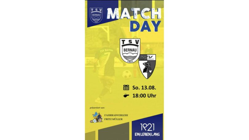 Am Sonntag 13.08. um 18:00 Uhr laufen die Fußballer-Herren des TSV Bernau zum ersten in der neuen Saison auf dem heimischen Rasen auf. Zu Gast ist der TSV Bad Endorf 2.
