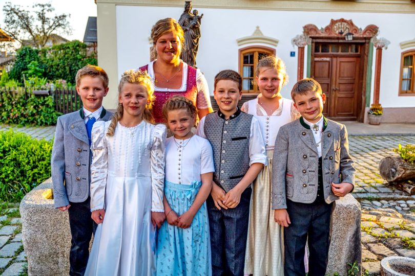 Sechs Kinder vom Samerberger Trachtenverein Almenrausch Roßholzen konnten heuer das Fest der Heiligen Erstkommunion feiern – hierzu diese Aufnahme: (v.l.) Martin, Magdalena, Franziska, Johannes, Magdalena und Matthias – so heißen die Roßholzner Erstkommunionkinder, die am 15.05.2022 in Törwang am Samerberg ihre Erstkommunion feiern durften. Irmi Fink (hinten im Bild) war dabei besonders stolz, denn sie begleitete die Kinder nicht nur zusammen mit Barbara Stuffer als Kommunionmutter während der Vorbereitung auf die Erstkommunion, sondern gleichzeitig alle sechs „Baschtler“ Erstkommunionkinder auch als Jugendleiterin des Vereins.