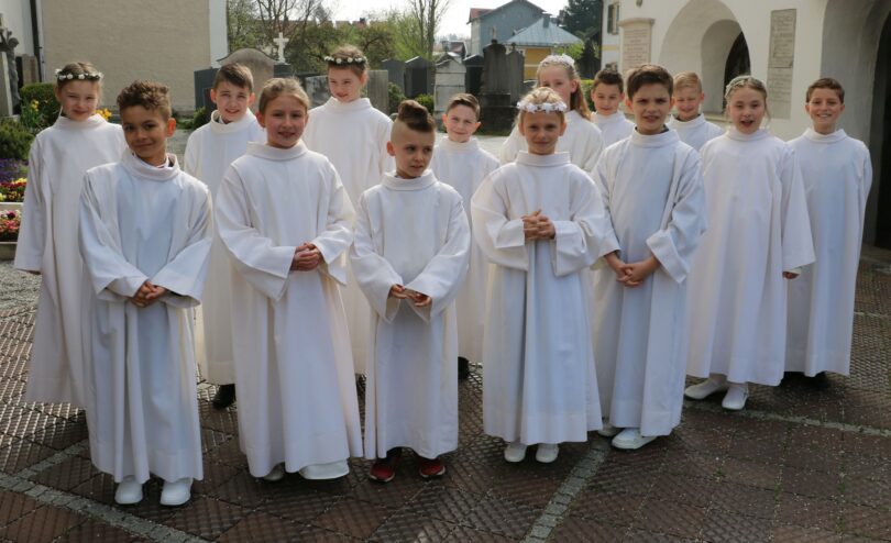 Sechs Mädchen und acht Buben feierten zusammen mit der Frasdorfer Pfarrgemeinde ihre Erstkommunion in der festlich geschmückten Pfarrkirche Sankt Margaretha in Frasdorf. Feierlich holte sie Pfarrer Hermann Overmeyer mit den Ministranten an der Friedhofskapelle ab und geleiteten sie an ihrem großen Tag ins Gotteshaus. „Ich bin der gute Hirte und sorge für die meinigen“, Pfarrer Overmeyer zeigte mit dem Beispiel vom Baum des Lebens im kindgerechten Erstkommunion-Gottesdienst im Zwiegespräch mit den Kindern auf, was für das Zusammenleben der Menschen wichtig ist.