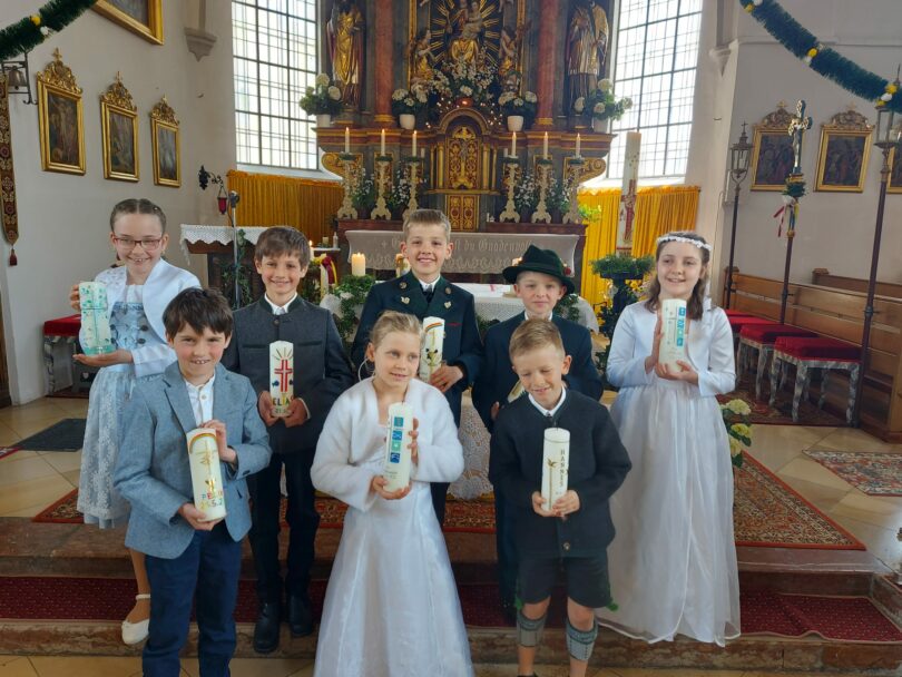 Bei der diesjährigen Erstkommunion in der Gemeinde Neukirchen am Teisenberg nahmen auch Trachtenkinder aus den Reihen des Trachtenvereins “D’Schwarzenberger” Neukirchen teil. Fünf Jungen und drei Mädchen aus dem Verein beteiligten sich somit erstmals an dem Sakrament der Eucharistie.