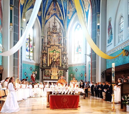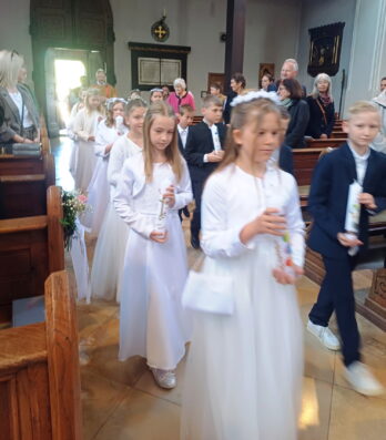 Voll besetzt mit den Gläubigen, Familien und Freunden der Kommunionkinder war die mit Blumen festlich geschmückte Pfarrkirche St. Nikolaus bei ihrer feierlichen Erstkommunion.17 Mädchen und zehn Buben traten erstmals an den Tisch des Herrn.