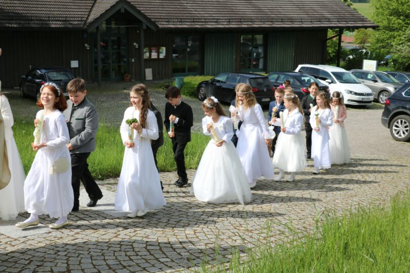 Aufregung pur bei den Kommunionkindern vor dem Wildenwarter Pfarrheim Christkönig – nur noch fünf Minuten bis zum großen Einzug in die Kirche. Pfarradministrator Gottfried Grengel geleitete in Wildenwart acht Mädchen und acht Buben erstmals zur heiligen Kommunion. Bei Maiwetter zogen alle gemeinsam ins schön geschmückte Gotteshaus Christkönig. Pfarradministrator Gottfried Grengel sprach im kindgerechten Erstkommunion-Gottesdienst mit den Kindern und hieß sie als neue Gäste am Tisch des Herrn willkommen: „Wir freuen uns euch Mädchen und Buben künftig häufig hier in der Christkönigskirche zu sehen, der Tisch des Herrn ist nicht nur heute, sondern auch in den kommenden Jahren stets für euch gedeckt“.