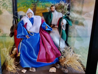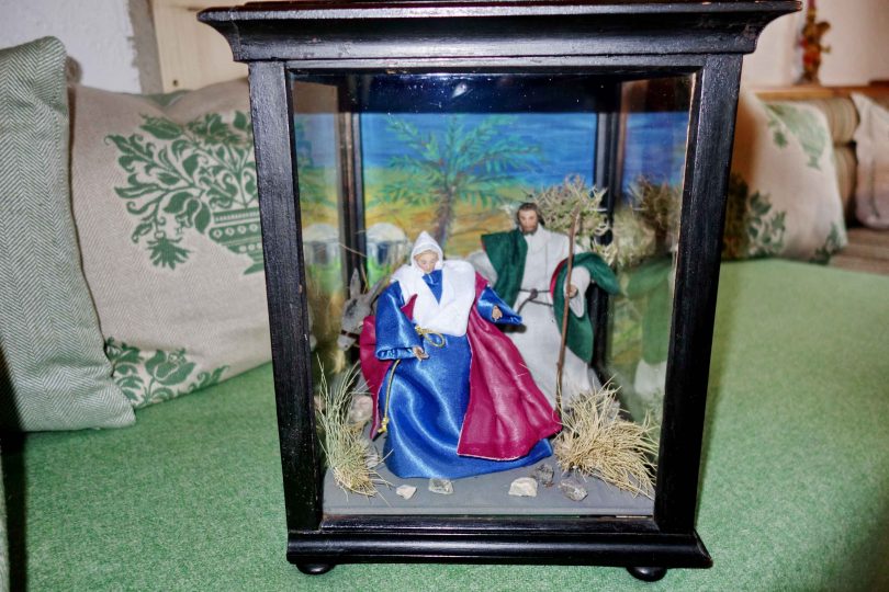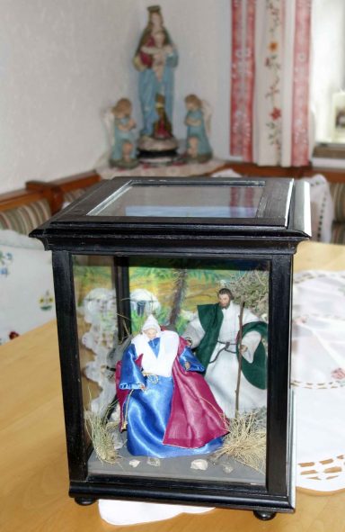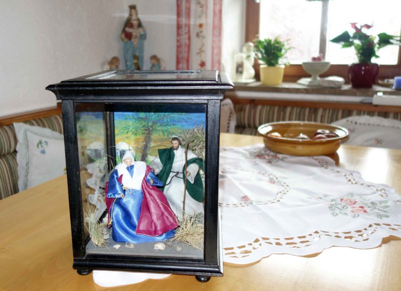 Fotos: Hötzelsperger – Das Figuren-Ensemble mit der schwangeren Maria in einem schönen Kasten, so wie es in Wildenwart im Advent von Haus zu Haus kommen wird.