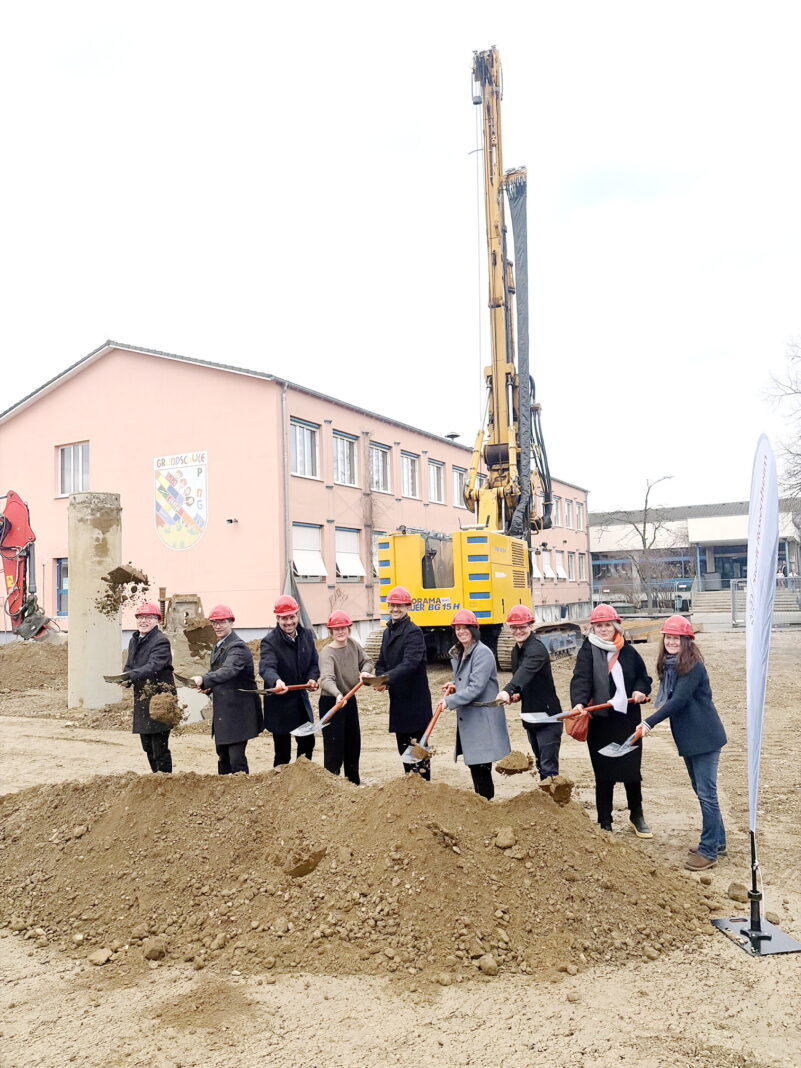 Mit einem symbolischen Spatenstich hat die umfangreiche Erweiterung der Grundschule Pang und die Aufstockung des benachbarten Kinderhauses begonnen. Ziel dieser Baumaßnahmen ist die Schaffung von Klassenräumen für vier weitere Grundschulklassen sowie Aufenthalts- und Mittagessensräume für die offene Ganztagsschule. Zudem entstehen durch den Umbau Betreuungsplätze für statt bisher 50, künftig insgesamt 125 Kinder in drei Kindergarten- und zwei Hortgruppen.