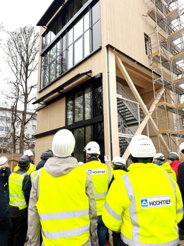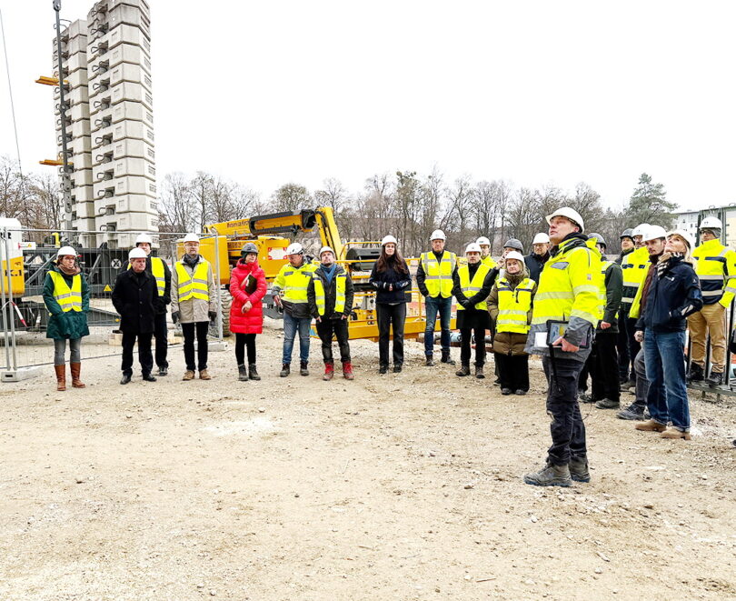Bei winterlichen Temperaturen stand die Bemusterung der beiden Fassaden des geplanten Gebäudekomplexes an. Die Begutachtung erfolgte an einem sogenannten „Fassaden-Mock-Up“ direkt auf dem Baufeld. Dabei handelt es sich um ein Vorführmodell, eine Nachbildung, die im Aussehen der späteren Holzfassaden exakt entspricht. Gemeinsam mit Behördenleiterin Doris Lackerbauer und dem Projektteam des Staatlichen Bauamtes Rosenheim, beurteilten die Bemusterung die Technische Hochschule mit ihrem Präsidenten, Professor Heinrich Köster, sowie die „ArGe TH Rosenheim“, Rubner Holzbau und Hochtief Infrastructure, und die mit der Generalplanung beauftragten karlundp Architekten sowie die Projektsteuerung, Hitzler Ingenieure. Dank der Bemusterung ist es möglich, sich schon in einem frühen Planungsstadium ein realistisches Bild der Fassadengestaltung zu machen und die architektonische Qualität abzusichern. Technische Details kamen bei der Bemusterung ebenso zur Sprache wie Farbe und Wirkung bei unterschiedlichsten Lichtverhältnissen. Der Erweiterungsbau für die Technische Hochschule Rosenheim wird in einer Holzhybridbauweise entstehen, bei dem ein möglichst hoher Holzbauanteil umgesetzt wird.