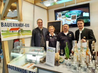 Die Erzeugergemeinschaft für Qualitätsgetreide Erding und Umgebung (EG) freut sich sehr, das 200. Mitglied willkommen zu heißen. Aus diesem Anlass überreichten EG-Geschäftsführer Daniel Gschlößl zusammen mit EG-Beirat Michael Hamburger am Bauernhofeis-Verkaufsstand auf der Internationalen Grünen Woche in Berlin ein kleines Präsent an das neue Mitglied Max Stangl aus Hörlkofen. Die Familie Stangl war das erste Mal mit ihrem Eisverkauf auf der Grünen Woche vertreten – natürlich am Stand des Landkreises Erding, wo „echt erding“ hochgehalten wird.