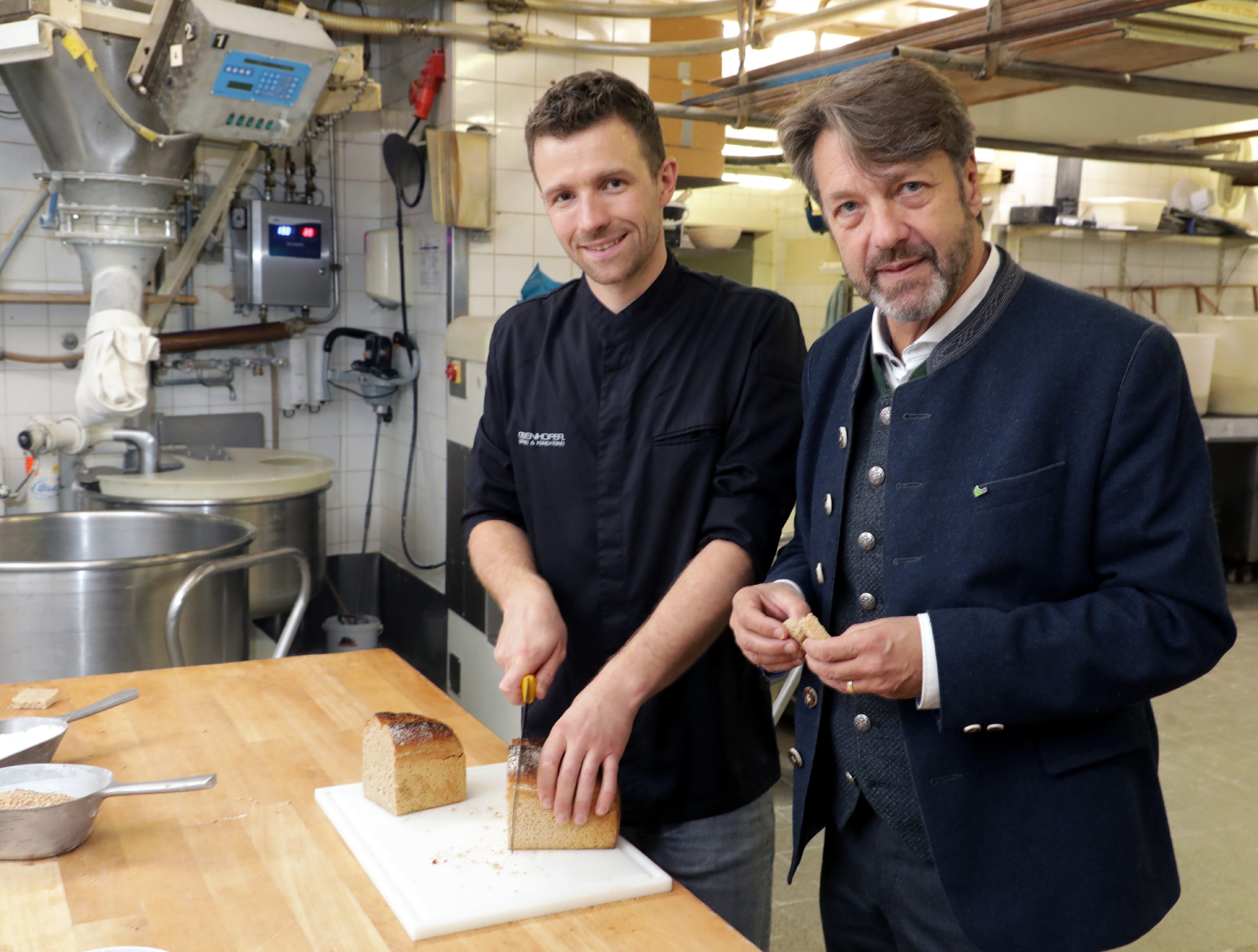 Bäcker Stefan Geisenhofer und LfL-Präsident Stephan Sedlmayer haben das erste Brot aus Freisinger Landweizen vorgestellt. (Foto: Rainer Lehmann / LfL)