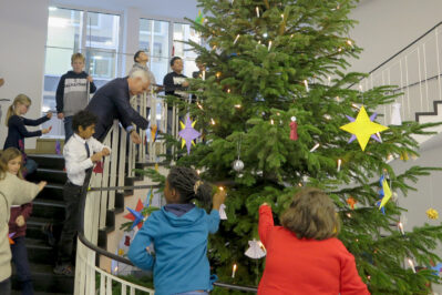Bericht und Bilder: Regierung von Oberbayern – Fotos vom gemeinsamen Schmücken des Christbaumes und dem gebastelten Baumschmuck sowie ein Gruppenfoto von Regierungspräsident Dr. Konrad Schober mit den Schülerinnen und Schülern sowie den Lehrkräften der Hachinger Tal Schule vor dem geschmückten Christbaum im Foyer der Regierung von Oberbayern.