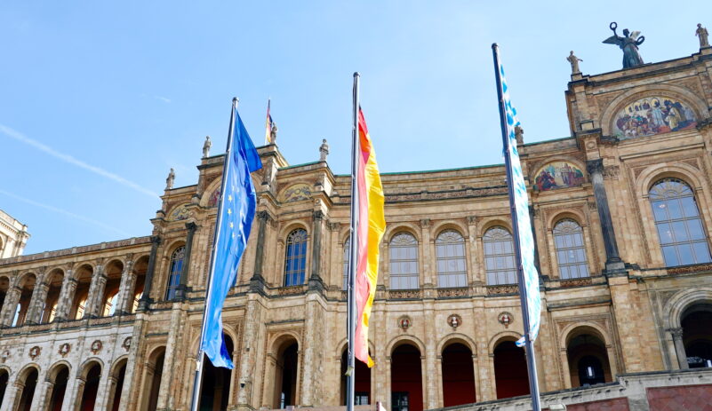 Foto: Fritz Lutzenberger – Die drei Fahnen vor dem Bayerischen Landtag sollten uns bewußt machen, dass die Wahlen zu Europäischen Parlament auch große Auswirkungen auf Deutschland und letztlich auf alle Bürgerinnen und Bürger in Bayern hat.