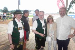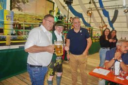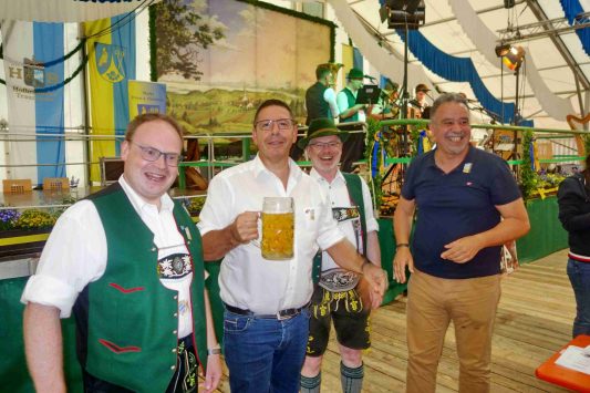 Fotos: Hötzelsperger – Eindrücke vom Ankunftsabend der Gäste aus Graulhet und Valdagno im Priener Festzelt – von links: Erster Bürgermeister Andreas Friedrich, Blaize Aznar, Bürgermeister von Graulhet, Zweiter Bürgermeister Michael Anner junior und Giancarlo Acerbi, Bürgermeister von Valdagno.