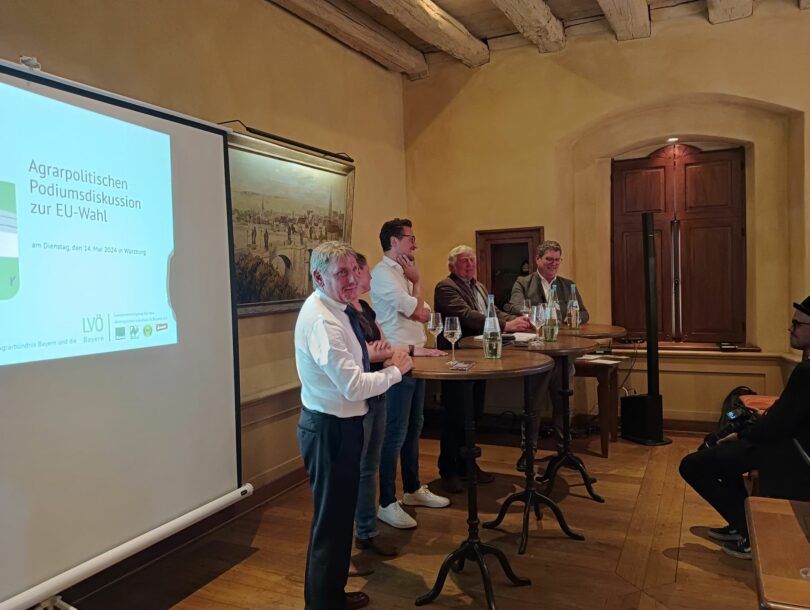 Auf Einladung der LVÖ Bayern e.V. und des Agrarbündnis’ Bayern waren Kandidierende von CSU, Freien Wählern, Bündnis 90/DIE GRÜNEN und ÖDP ins Weingut Juliusspital gekommen. Kandidierende der SPD und FDP waren aus Termingründen verhindert. Die Podiumsteilnehmenden diskutierten vor allem über zwei brisante Themen: die Deregulierung der neuen Gentechniken für die Pflanzenzucht sowie die Verteilung von mehreren Milliarden Euro EU-Agrarförderung.