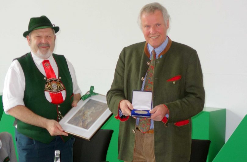Foto/s: Hötzelsperger – Prof. Dr. Jürgen Vocke (re.) bei der Medaillen- und Urkunden-Übergabe an Bayerns Trachtler-Landesvorsitzenden Max Bertl.
