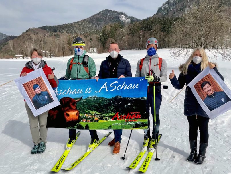 Everesting Kampenwand locker flockig erreicht – In nur 14 Std. ging es 10x die Kampenwand rauf und runter – Ein Brüder-Paar aus Aschau schafft es – Die beiden jungen Aschauer, Alex (20) und Alois Kunz (24), Mitglieder in der Perspektiv Mannschaft „Skibergsteigen“ suchten zum Ende der Saison noch einmal eine besondere sportliche Herausforderung, nachdem –Corona bedingt- in Deutschland sämtliche Rennen ausgefallen waren. Was lag da näher, als den Aschauer Hausberg, die Kampenwand, an einem Tag, 10mal rauf und runter zu besteigen. Das heißt: 10x von der Talstation (626m) zur Steinlingalm 1.437m mit den Skitourenski aufzusteigen und abzufahren. Im Vordergrund standen dabei für die jungen leidenschaftlichen Sportler, die Freude an der Bewegung in der Natur und das Erreichen eines gemeinsamen Zieles. So entstand aus einem spontanen Entschluss die Idee, die guten Schnee- und Wetterbedingungen zu nutzen, und die selbstgestellte Zielsetzung in die Tat umzusetzen. Gesagt, getan. So starteten die beiden am vergangenen Dienstag um 4.00 Uhr in der Früh. Nach insgesamt nur 14 Stunden 10 Min (reine Aufstieg- bzw. Abfahrtszeit 13 Std. 09 Min.) beendeten sie erfolgreich ihr gemeinsames Abenteuer. Anlass genug, dass bestückt mit Fan-Fahnen das Team der Tourist Info Aschau, stellvertretend für die Gemeinde Aschau i.Chjemgau, zur herausragenden Leistung gratulierte. Tourismuschef Herbert Reiter (Mitte) überreichte dabei an Alex Kunz (links) und Alois Kunz (rechts) als Anerkennung für die schweißtreibende Höchstleistung jeden ein Aschau-Handtuch für Momente zum Ausruhen. Um 18:00 Uhr war es dann soweit und mit einem lockeren Schwung haben die beiden durch ihre letzte Talfahrt ihr Ziel erreicht. Erschöpft, aber überglücklich besiegelten sie ihr Vorhaben mit 8855 Höhenmetern und knapp 83 Kilometern . Somit wurde „Everesting Kampenwand“ zuhause absolviert., das heißt, die Höhenmeter überragen den höchsten Berg der Welt, den Mount Everest mit 8848 ü.d.M.