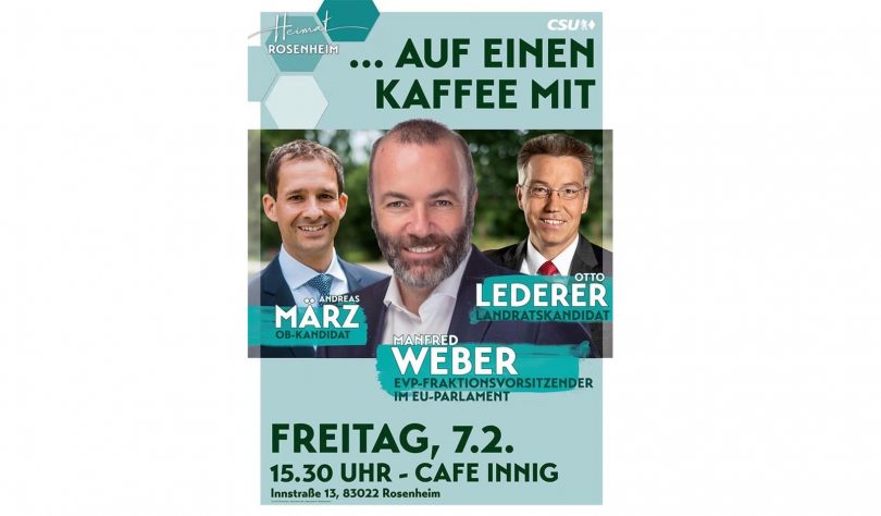 Die Kreisverbände Rosenheim Stadt und Landen laden „Auf einen Kaffee mit Manfred Weber“ ein. Der stellvertretende Parteivorsitzende und EVP Fraktionschef kommt am Freitag den 7. Februar um 15.30 Uhr ins Cafe Innig. Oberbürgermeisterkandidat Andreas März und Landratskandidat Otto Lederer werden ebenfalls zu Gast sein.