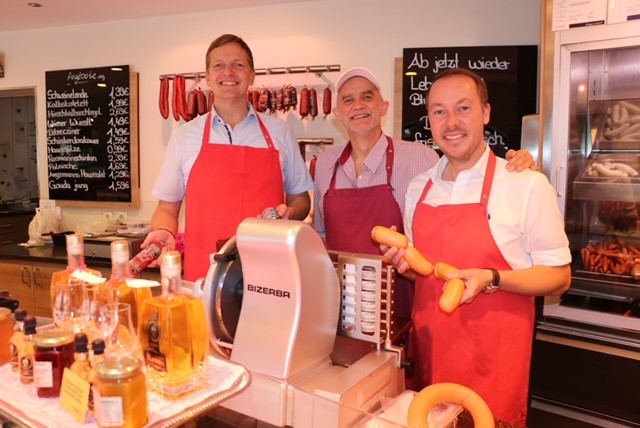 „Was darf es denn sein? Eine Leberkässemmel oder eine Lyoner fürn Wurstsalat?“ Verwundert schaute die Kundschaft in der Metzgerei Angermann drein: da standen doch tatsächlich neben den sechs Metzgereifachverkäuferinnen auch noch Bürgermeister Simon Frank und Tourismuschef Herbert Reiter hinter der Ladentheke und versuchten sich – stilecht mit roter Schürze gewandet – als Fleisch- und Wurstverkäufer. Besonders die ganz junge Kundschaft freute sich über die Arbeit des Bürgermeisters, war sie doch für alle mit einem Radl Gelbwurst oder einem Wienerwürstl für sie verbunden. Metzgermeister Richard Angermann führte seine beiden Schnupperlehrlinge behutsam in die ungewohnte Tätigkeit ein. Für den Ausbildungsabschnitt „Kontakt mit dem Publikum, Konversation und Verkaufsgespräch“ vergab er gute Noten, alle anderen Fächer sind noch ausbaufähig. Die Kundschaft war sehr angetan von ihrem Bürgermeister zum Anfassen, der mit dieser Aktion „Fachkräftetag“ in Aschau ganz neue Wege beschritt und zusammen mit seine beiden Vertretern Michael Andrelang und Monika Schmid, Tourismuschef Herbert Reiter, den Gemeinderäten Wolf Neelsen und Sebastian Pertl sowie Pfarrer Paul Janßen und Pfarrerin Betina Heckner in die Aschauer Arbeitswelt hineinschnupperte. „Wir sehen immer nur, dass in Aschau noch weitgehend alles in Ordnung ist, dass Aschau ein Dorf der kurzen Wege ist und alle notwendigen Branchen immer noch im Ort vertreten sind. Warum das so ist, darüber machen sich die wenigsten Gedanken, solange alles funktioniert. Die Gemeinde Aschau ist stolz auf ihre Firmen, Betriebe, Geschäfte, Einrichtungen und Dienstleister, egal, um welche Branche es sich handelt“, so Bürgermeister Simon Frank. „Egal ob Inhaber, Geschäftsführer, Hilfskraft, Fachkraft oder Auszubildender, jeder einzelne Mitarbeiter in den vielen Aschauer Betrieben trägt einen wichtigen Teil zu einem funktionierenden Dorfleben teil“.