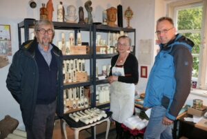 Pfarrer Paul Janßen (rechts) und Gemeinderat Wolf Neelsen (links) in der Kerzenwerkstätte Huba bei Alraune Huba