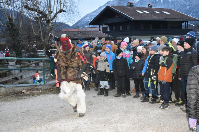 Auf dem Dorfplatz von Schleching standen alle Altersgruppen in gespannter Erwartung, wann es endlich losgeht zur angekündigten Fackelwanderung der Geigelstoa Pass. Als dann wie aus dem nichts die ersten beiden Krampein auftauchten, formierte sich ein langer Zug, der den furchteinflößenden Gestalten folgte. Es ging quer durchs Dorf vorbei beim Wiaschdei, wo verdächtiger Qualm unter dem Scheunentor hervorquoll und hörbares Gerassel auf weitere Krampein schließen ließ.